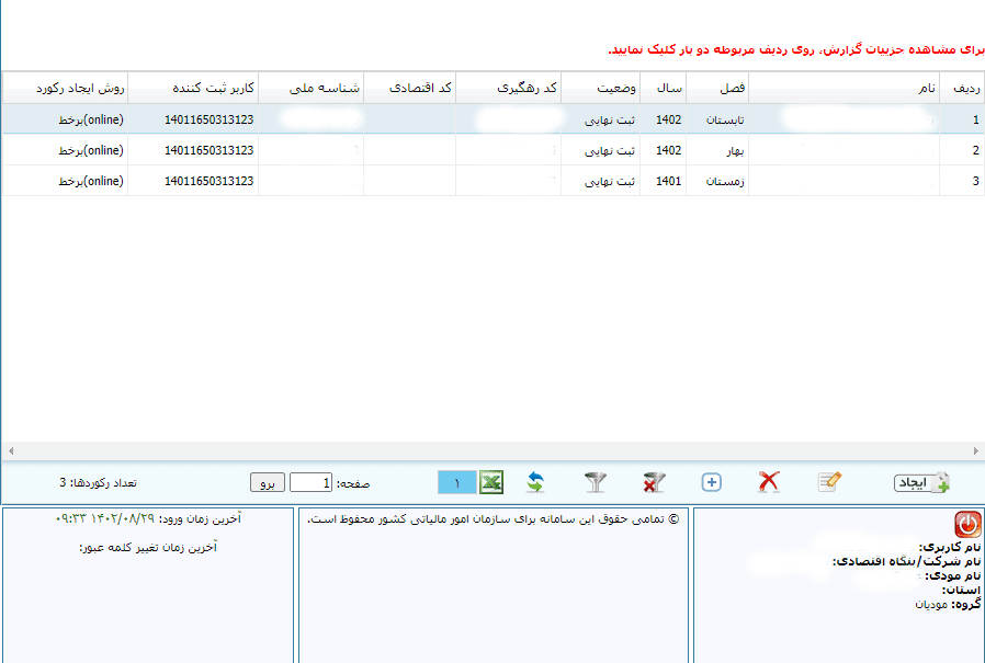 - پس از انتخاب گزینه ایجاد وارد صفحه زیر میشوید. در این صفحه باید فصل و سال مالی که قصد گزارش معاملات آن را دارید انتخاب نمایید