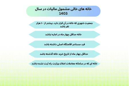 بر مبنای ماده 54 مکرر ق.م.م، خانههایی که بیش از 120 روز در یک سال خالی باشند، اگر یکی از شرایط گفته شده در مقاله را داشته باشد، مشمول مالیات خواهند شد.